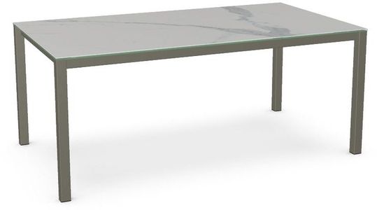 Italian porcelain on glass tabletop with a Statuario marble finish.