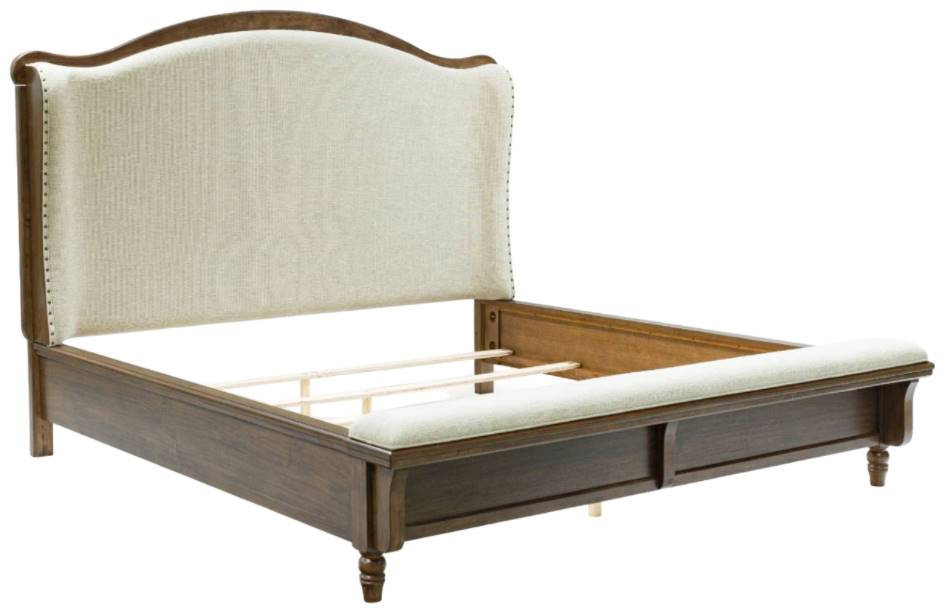 Includes upholstered headboard, panel rails and bench footboard with slats