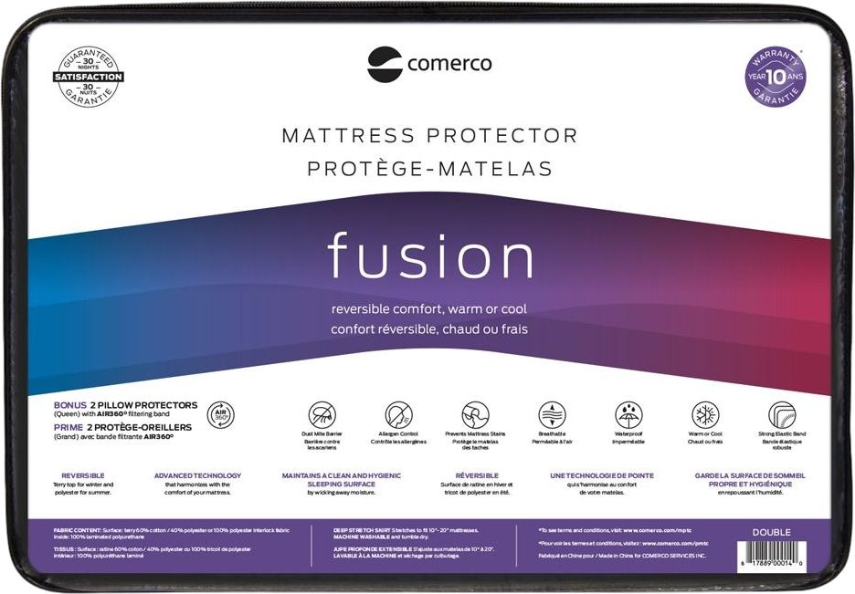 Choose the best in comfort and protection with Comerco's Fusion mattress protector. Designed to adapt to every season, this reversible mattress protector offers a cozy terry surface for winter and a cool polyester knit for summer. 100% waterproof and breathable, it provides a clean and healthy sleep surface.Read More
