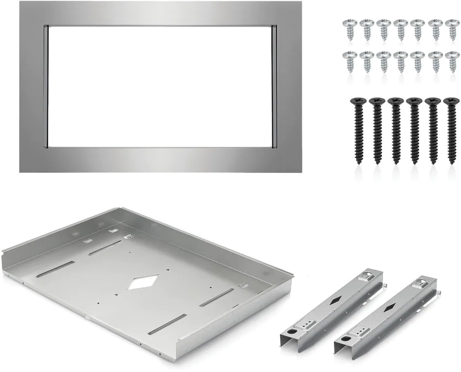Includes all the parts and pieces to complete the installation of your built-in microwave, including 1 front frame assembly, 1 exhaust duct, 1 bottom mounting rail and 6 screws.