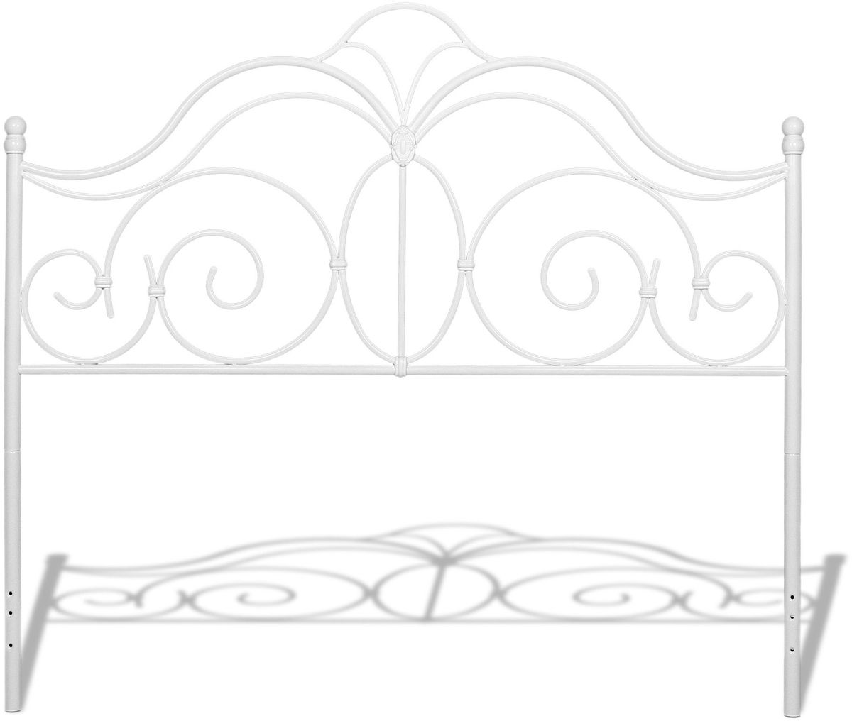 The Rhapsody features soft, pretty curves, making it a lovely focal point for any bedroom. Constructed of carbon steel, the 55-inch grill includes fanciful waves, delicate scrolls, and posts topped with round aluminum cast finials to complement the delightful style. This aesthetically pleasing bed has a Glossy White finish to make a statement with the unique headboard. This bedroom piece is equally at home with bold, bright top-of-bed or soft, muted pastels. A good ornamental (or fashionable) headboard will fuse with the surrounding decor, accent your other bedroom furniture and transform a room from ordinary into something interesting and sophisticated. This includes a headboard, instruction sheet, and hardware bag with everything needed for assembly. The Rhapsody Headboard comes with a 10-year limited warranty against manufacturing defects. A bed frame is not included for box spring or mattress support.
