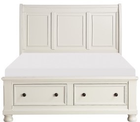 The Queen sleigh platform bed features a white finish can transition from traditional to country casual, with accents including - antiqued bronze knob hardware on the footboard’s drawer’s framed fronts and bun feet providing support.Read More