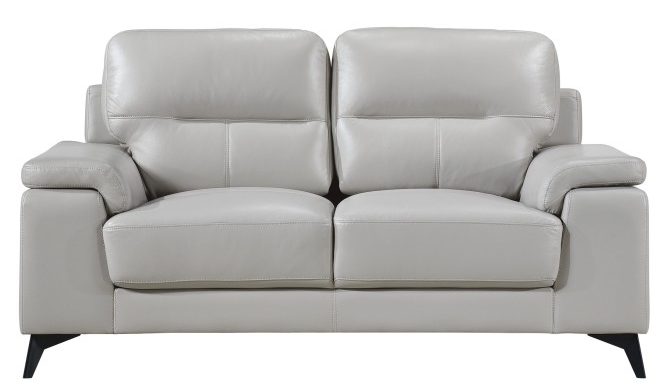 Styled for the modern home, the Mischa Collection’s love seat blends the luxurious feel of leather with the comfort of plush seating. The silver top grain leather cover, with bi-cast vinyl match, enhances the sleek profile of the collection. Contoured pillow-top arms and black metal legs further enhance the modern stance. Coordinating sofa and chair are available as well as an optional dark gray top grain leather cover with bi-cast vinyl match.Read More