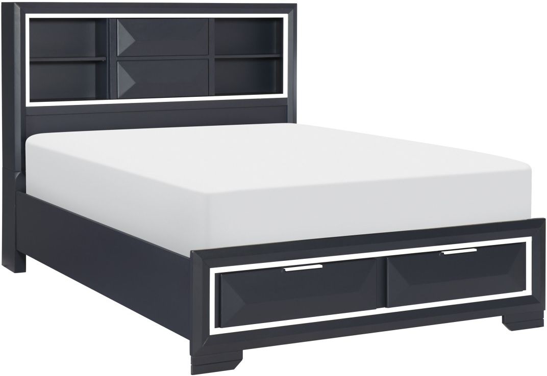 The modern design of the Rosemont Collection creates a striking profile for your bedroom. The midnight blue finish is reflected by the chrome banding that defines the front of the Eastern King bed. The hidden bookcase headboard and storage footboard proved additional functional storage space beyond a traditional case piece.Read More