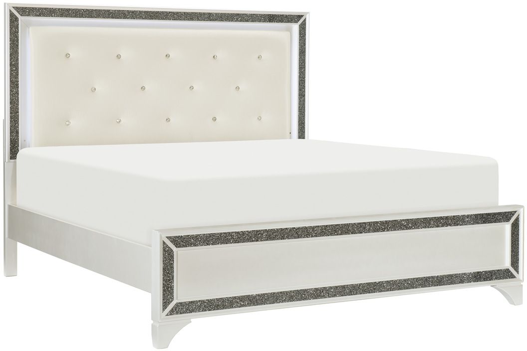 The white pearlescent finish is enhanced by the silver glitter trim that frames the bed's profile. The Queen headboard features a padded faux leather insert that is accented by faux crystal button-tufting and LED-backlighting, that serves as the centerpiece of this sparkling collection.Read More
