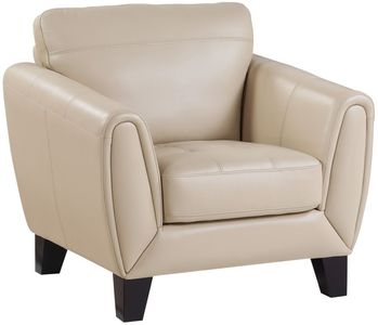 The subtle retro look of the Spivey Collection will pair with modern aesthetic of your home’s décor, creating a classically cool look that is sure to turn heads. The streamlined profile of the chair is covered in an beige hued top grain leather. Defining detail comes in the form of the arm’s contour stitching and the cushioned wrap of the chair’s arms.