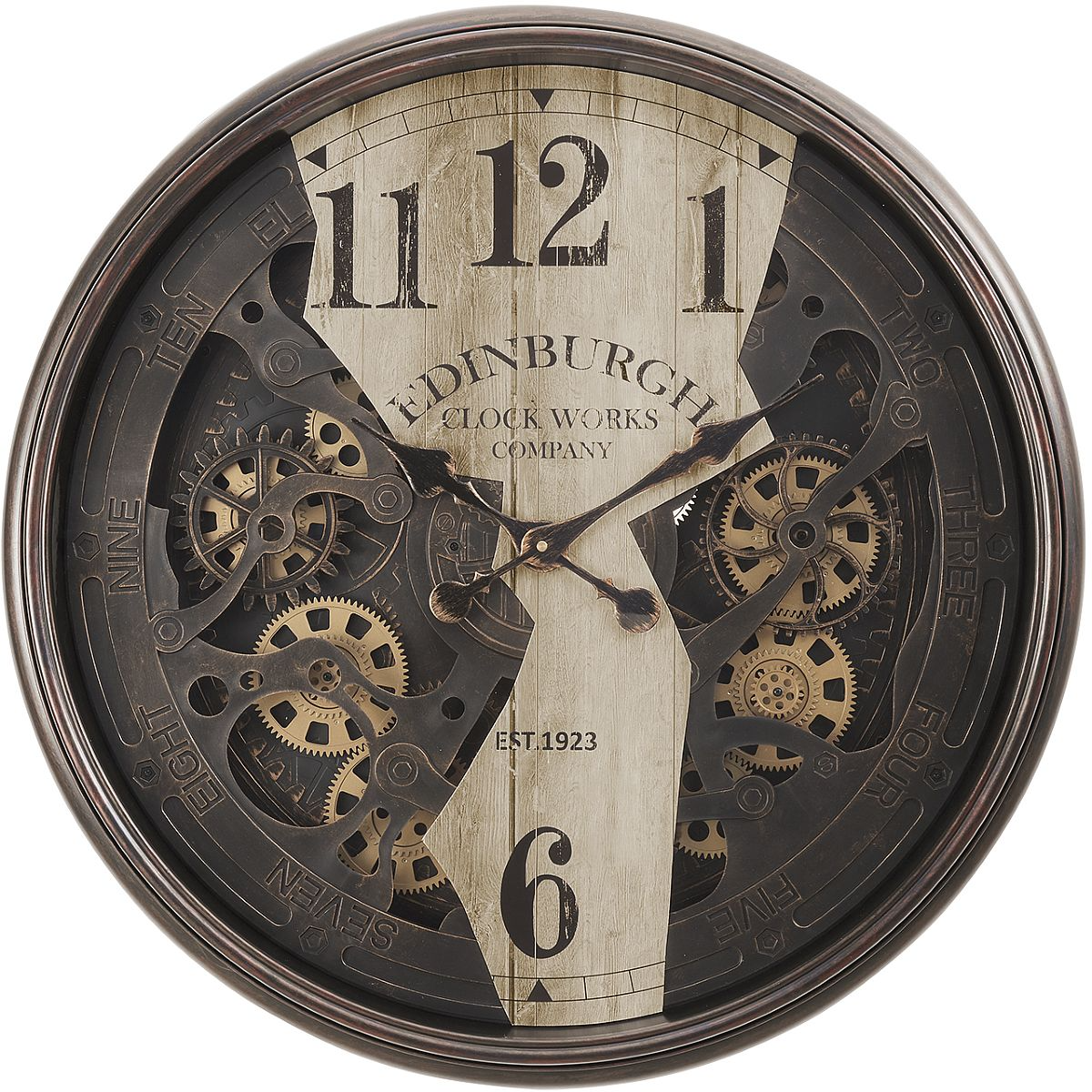 Add some industrial chic to your home with this stunning 30" round wall clock with a moving gear mechanism, perfect for making a statement in a transitional space from the living room to the office. This large, oversized clock features a durable plastic frame in a warm dark brown finish and a clear glass surface for a sleek finish.Read More