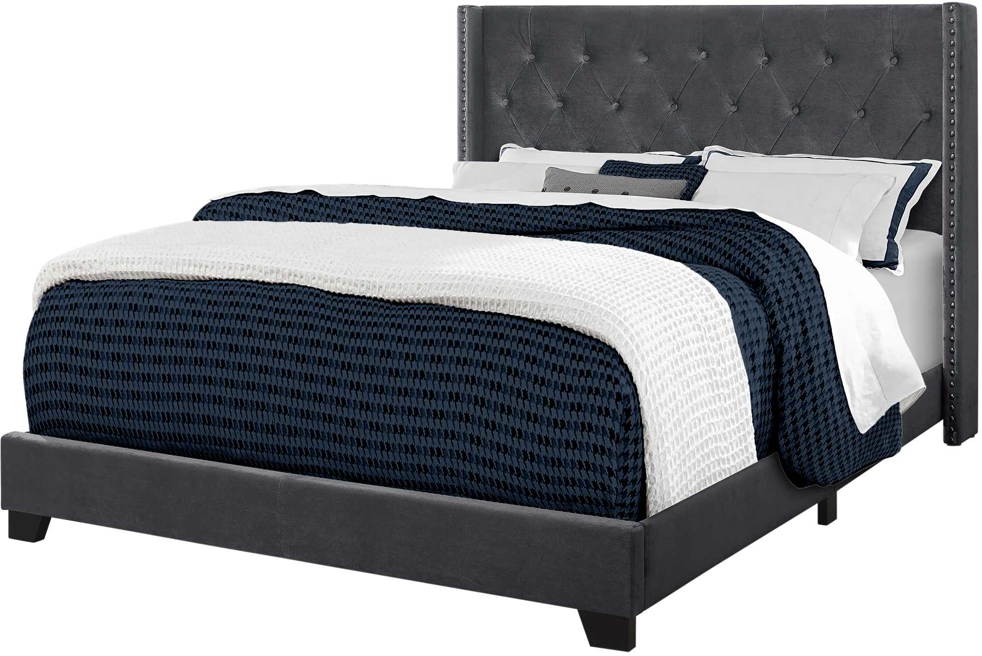 Give your bedroom a master appearance with this luxurious queen size bed frame with a wingback headboard upholstered in a rich dark grey velvet-look fabric. The classic contemporary style of this floor length headboard, outlined with chrome nail head trim down the sides and cushioned diamond tufting, gives the bed an understated flair. The clean lines of the upholstered sides and front frame along with the black solid wood legs, slightly angled at the front, adds stability to the whole bed frame. The box spring and mattress is not included and must be purchased separately. All parts and hardware for assembly are conveniently located inside the headboard.