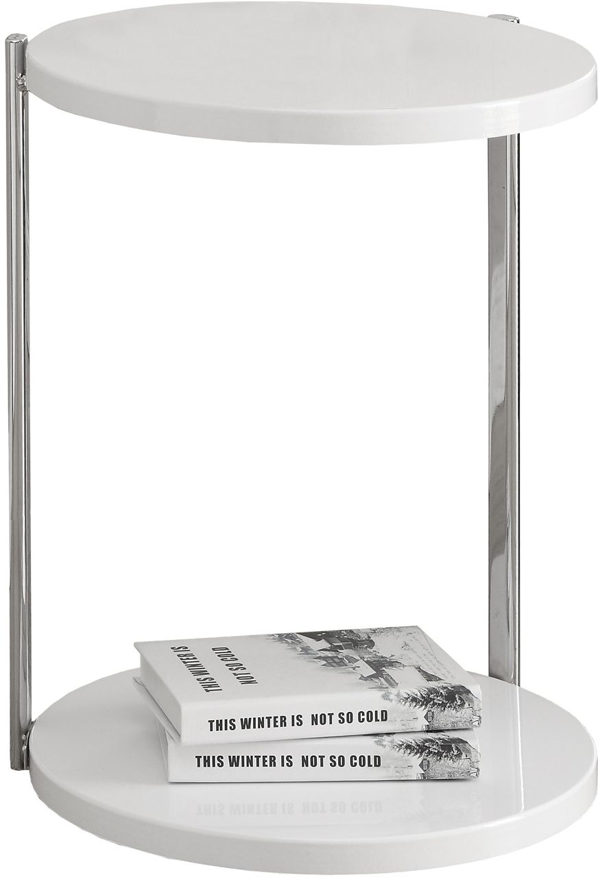 To have or not to have just isn't a question! This stylish glossy white round accent table offers a simple yet convenient place to put down your drinks, snacks, meals or even a tablet while lounging on your couch or entertaining. The sturdy yet fashionable chrome metal supports with an extra shelf at the bottom provide additional storage for this must-have table. Use this versatile contemporary snack and accent table for your living room, office space, family room or den.