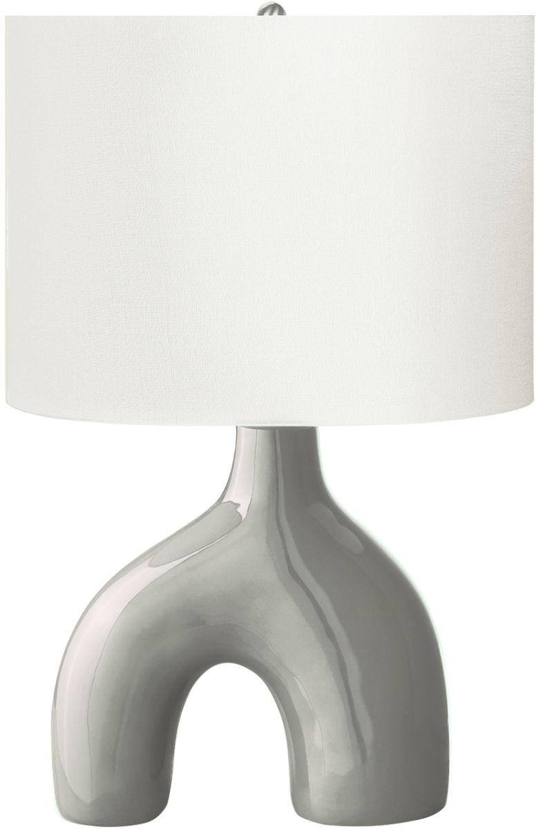 Add a fun and decorative element to your home with this stylish, mid-century inspired 25" table lamp in light grey ceramic with an elegant linen ivory shade. This decorative table lamp will brighten up any room with its contemporary and whimsical two-leg shape ceramic base and linen-blend fabric shade.Read More