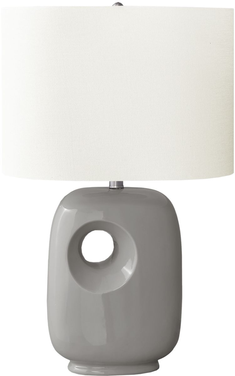 Illuminate your space with this modern and trendy 26"h table lamp with a sleek dark grey ceramic base and topped with a linen-blend, ivory fabric shade. The architectural and contemporary cut-out design on this lighting piece will easily brighten and elevate your home decor whether placed on an end or side table, or on a nightstand as a chic decorative and functional accent.Read More