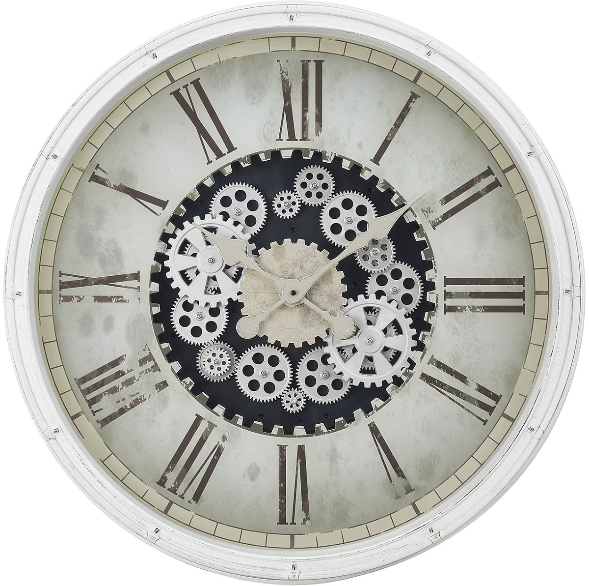 Stay right on trend with this chic 30" round wall clock in white, featuring an exposed gear mechanism design. This large, oversized wall clock in a transitional style is crafted with a durable plastic frame and a clear glass surface over the easy to read, printed roman numeric markings.Read More