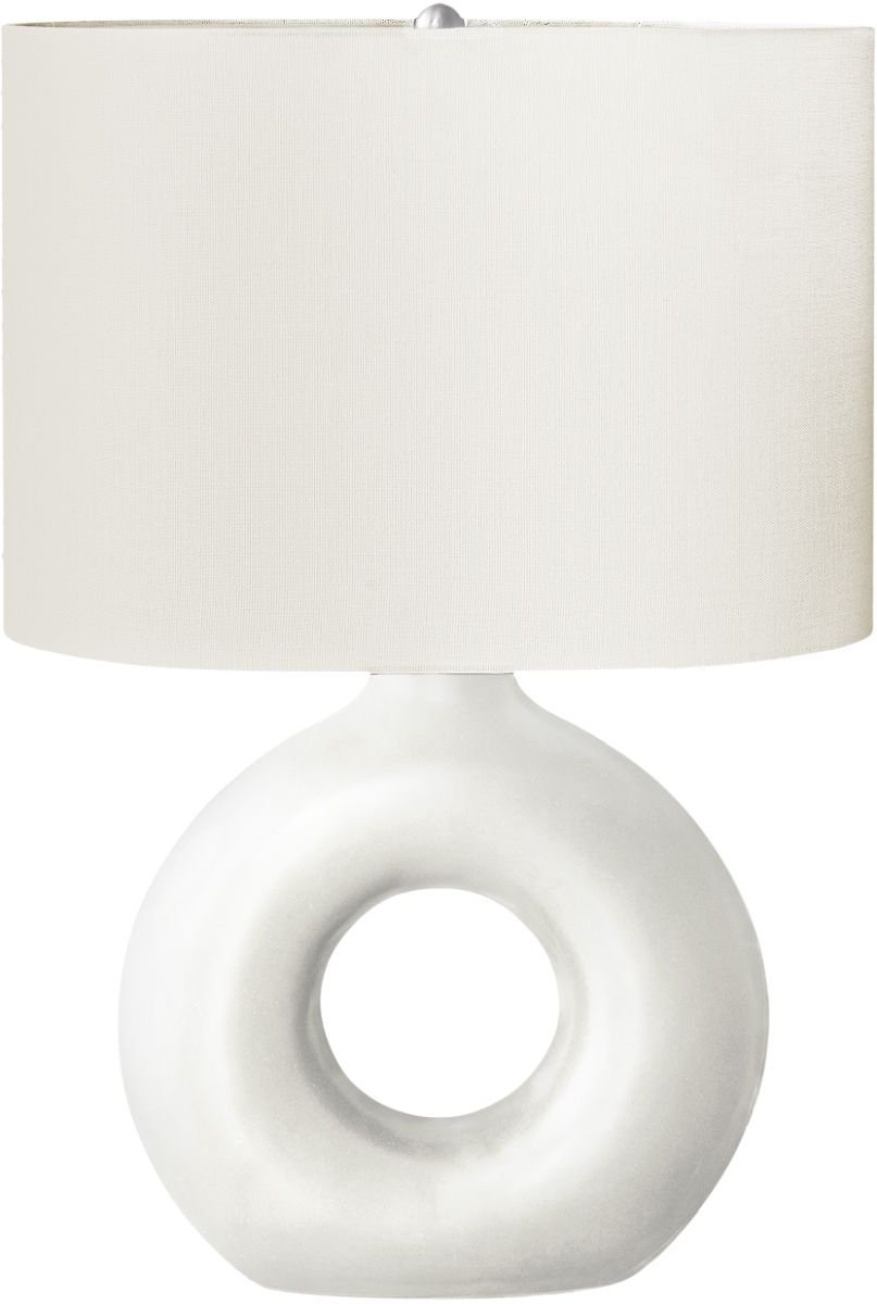 Add some modern ambiance to your home with this stylish and trendy 24" table lamp in white ceramic with a chic ivory shade. This decorative table lamp will brighten up any room with its contemporary, donut-shaped ceramic base and oval linen-blend fabric shade.Read More