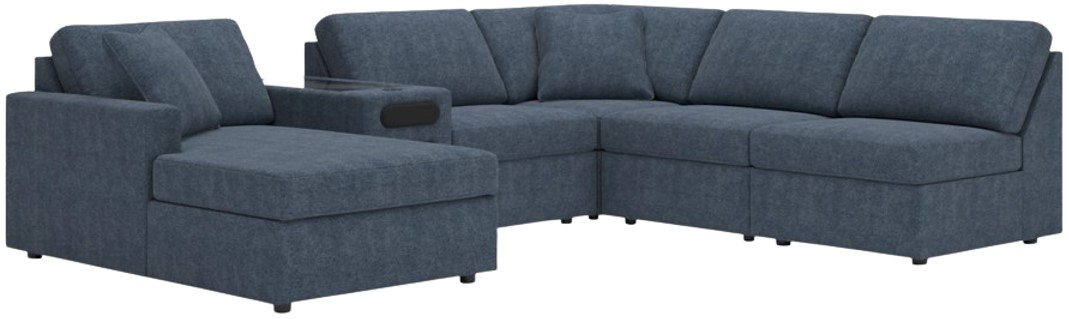 Includes 6 Modular Pieces: Left-arm facing corner chaise, 3 armless chairs, wedge and audio console with storage
