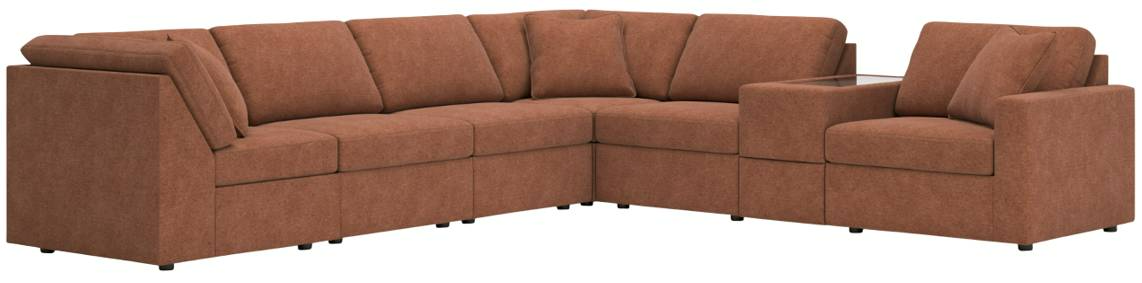 Includes 7 Modular Pieces: Right-arm facing corner chair, 3 armless chairs, console with storage and 2 wedges