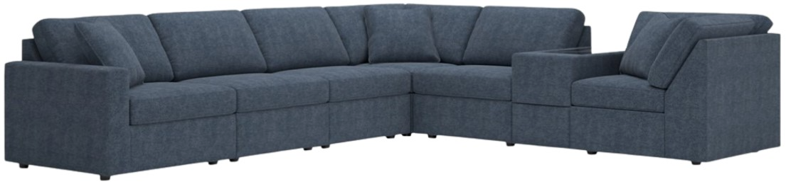 Includes 7 Modular Pieces: Left-arm facing corner chair, 3 armless chairs, console with storage and 2 wedges