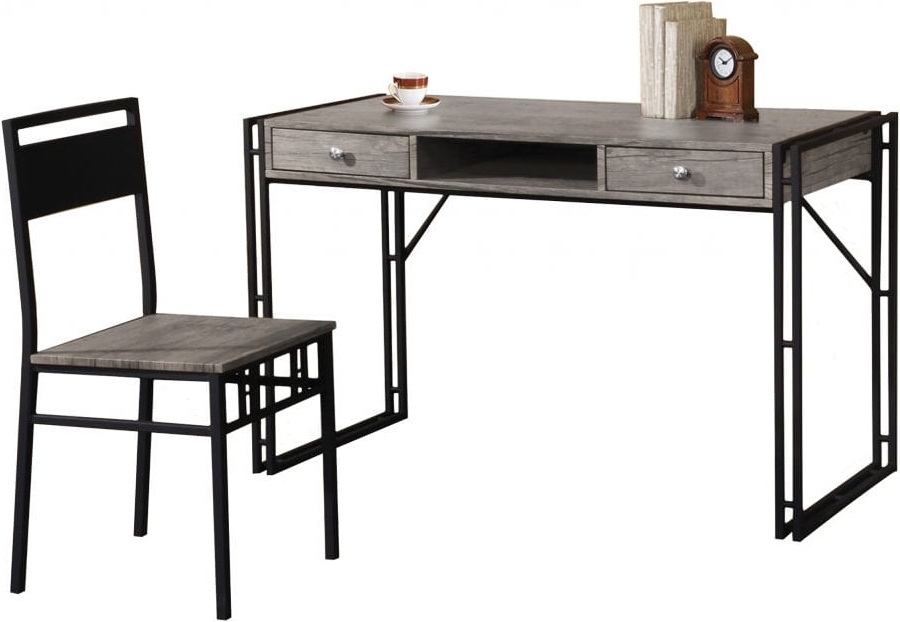 This stylish desk and chair set includes architectural metal leg support and a distressed grey finish over a sturdy mix of solid wood and engineered wood. Desk includes 2 drawers and centre storage area.Read More