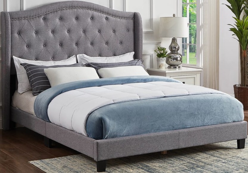 This upholstered bed brings a level of sophistication sure to impress to the bedroom. Includes curved wings and headboard, a nail head trim and button tufting for the ultimate, eye catching design. Box spring required.Read More