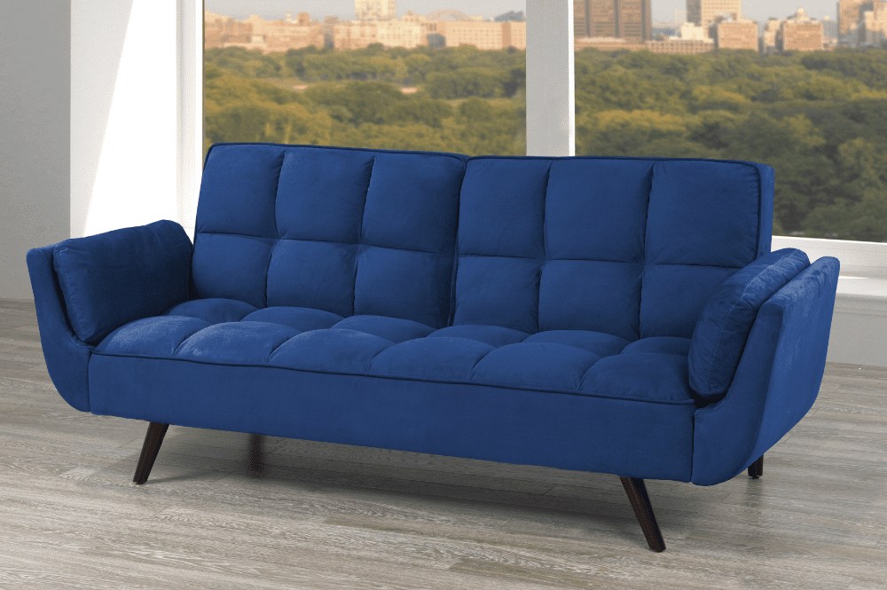 Visually stunning, comfortable and easy to transition, this klick klack is a success in every category. From the royal blue, velvet-style fabric, to the overstuffed, plush cushioning for added comfort, and stylish stationary arms, this piece is designed to impress. Transitions from traditional sofa, to lounge mode, to full-size bed.Read More